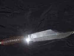 This bowie knife is built of hand forged Barnett damascus steel. The blade which measures 9 inches exhibits the beautiful pattern that damascus steel can only afford. The desert ironwood handle is carved into a basket weave for comfortable handling and extends the knife's overall length to almost 14 inches. This is a knife that will take whatever you put it through. I have often called the knife a "bow-axe" because of the heavy use it will take. The knife comes with a hand sewn leather holster that is engraved.