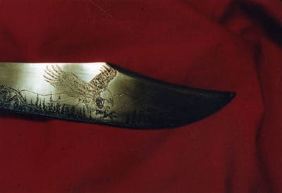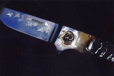 Custom maple leaf engraving on a customer's Schrade D'holder knife