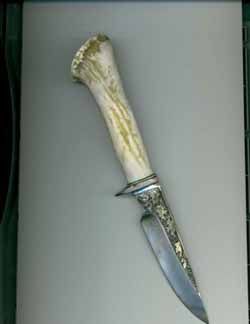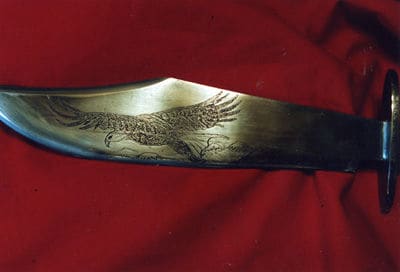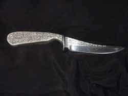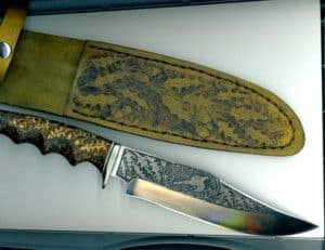 Hand engraved hunting knife with oak leaves and pheasant medallion